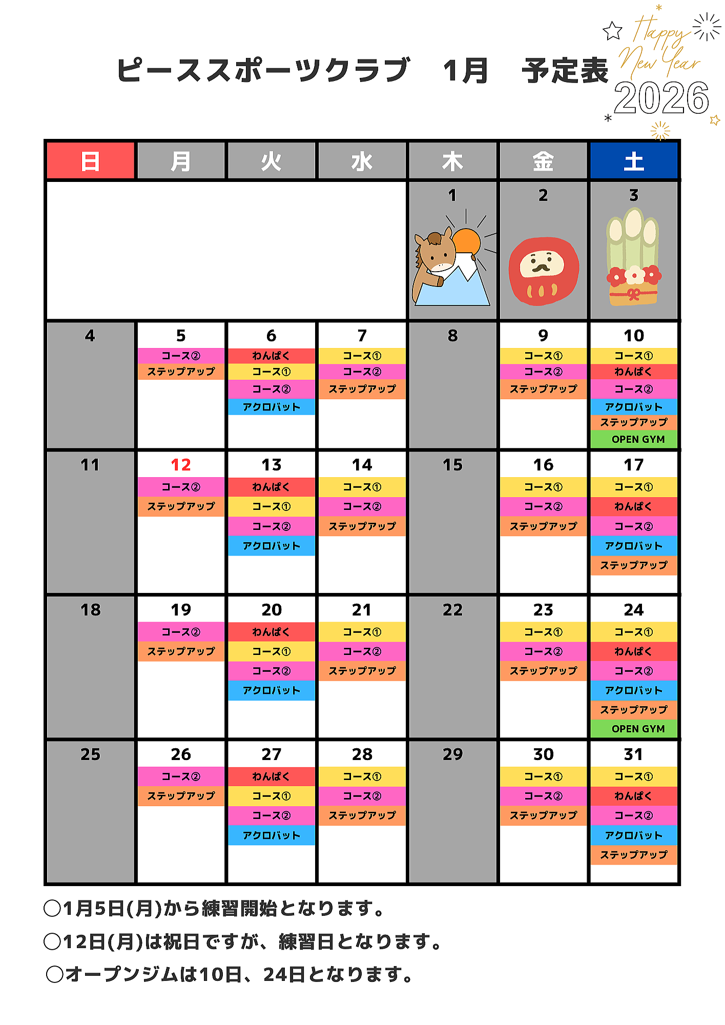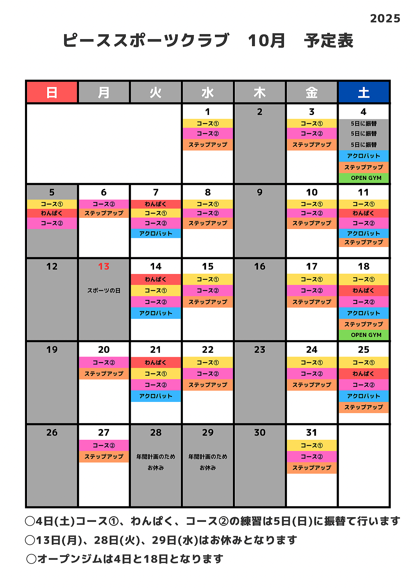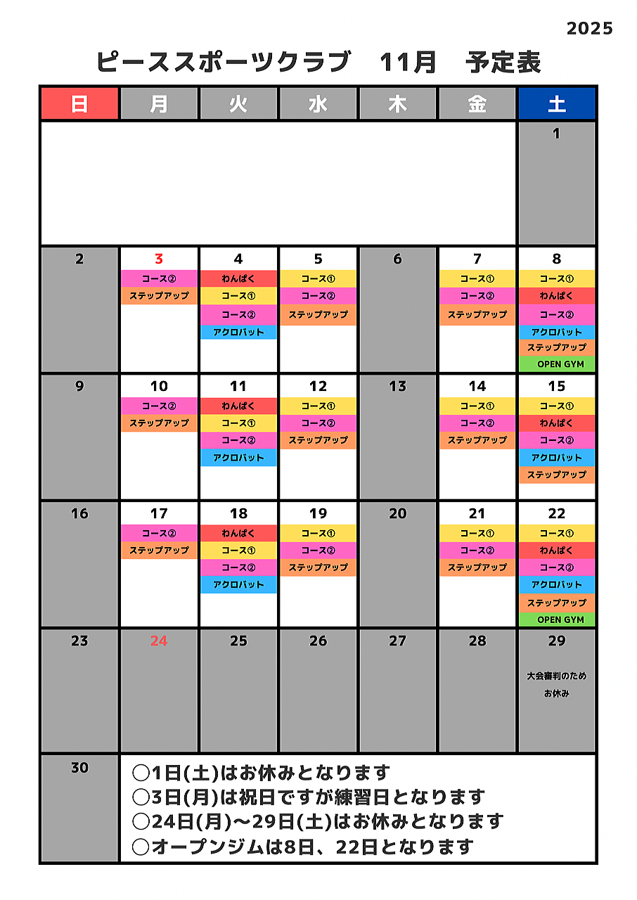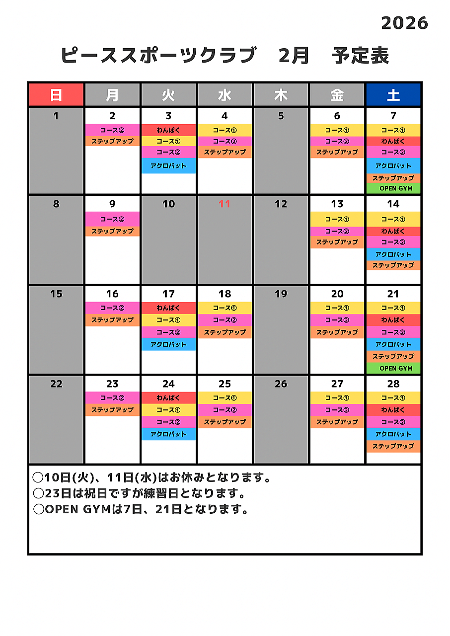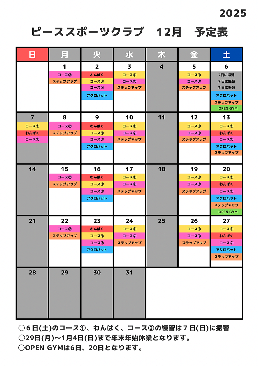 | *詳しくは月別カレンダーを確認して下さい。ホームページからも確認頂けます。https://www.peace-s-c.com |