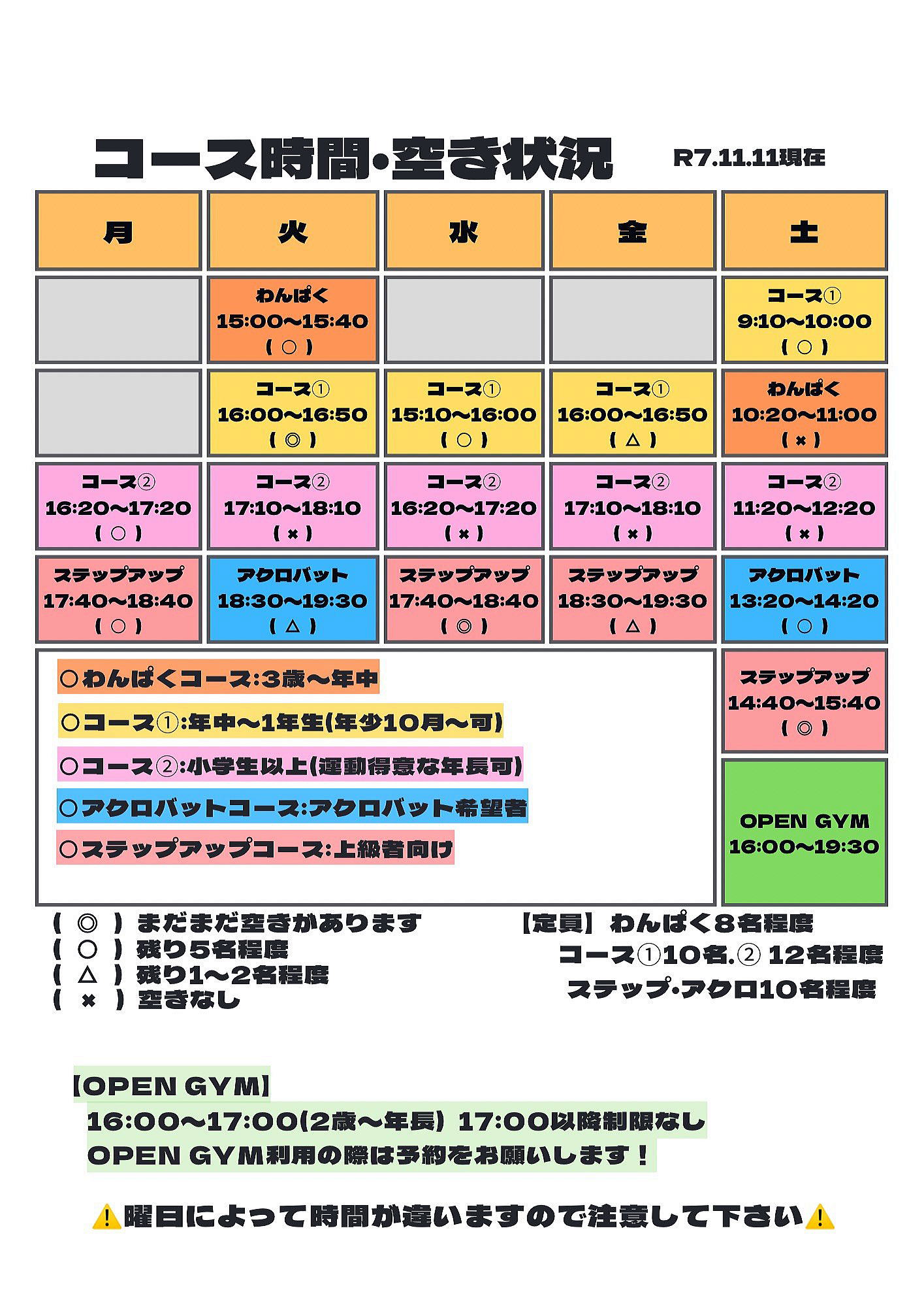 | *グレーで塗りつぶしの日は(わんぱく・コース①・コース②ステップアップ・アクロ)はお休みです。 |